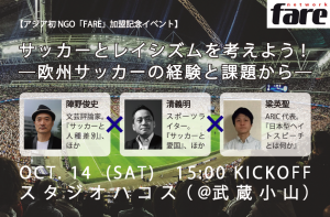 ヨーロッパではサッカー界でこれまでNGOを中心にレイシズム問題への取り組みが行われてきています。最も大きな国際NGO『FARE(https://www.farenet.org)』はFIFA(国際サッカー連盟)やUEFA(ヨーロッパサッカー連盟)と提携し、ヨーロッパ35カ国で様々な取り組みを行っています。ARIC(反レイシズム情報センター)ではこれまでサッカーにおけるレイシズムの問題に取り組んできましたが、この度『FARE』にアジアで初めて日本支部として加盟しました!