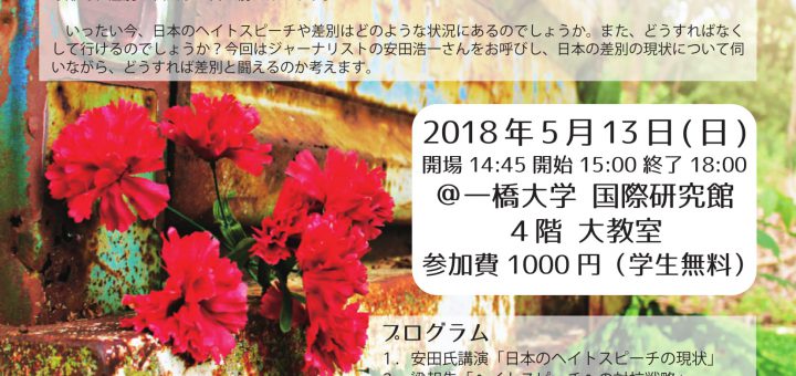 イベント 2018年4月23日 by antiracism-info · Published 2018年4月23日 · Last modified 2018年5月4日 5/13@一橋大学 安田浩一氏講演イベント開催決定! 「ジャーナリスト 安田浩一氏講演会 ヘイトスピーチの最前線〜在日・沖縄・女性差別〜」 2018 年、東京オ...