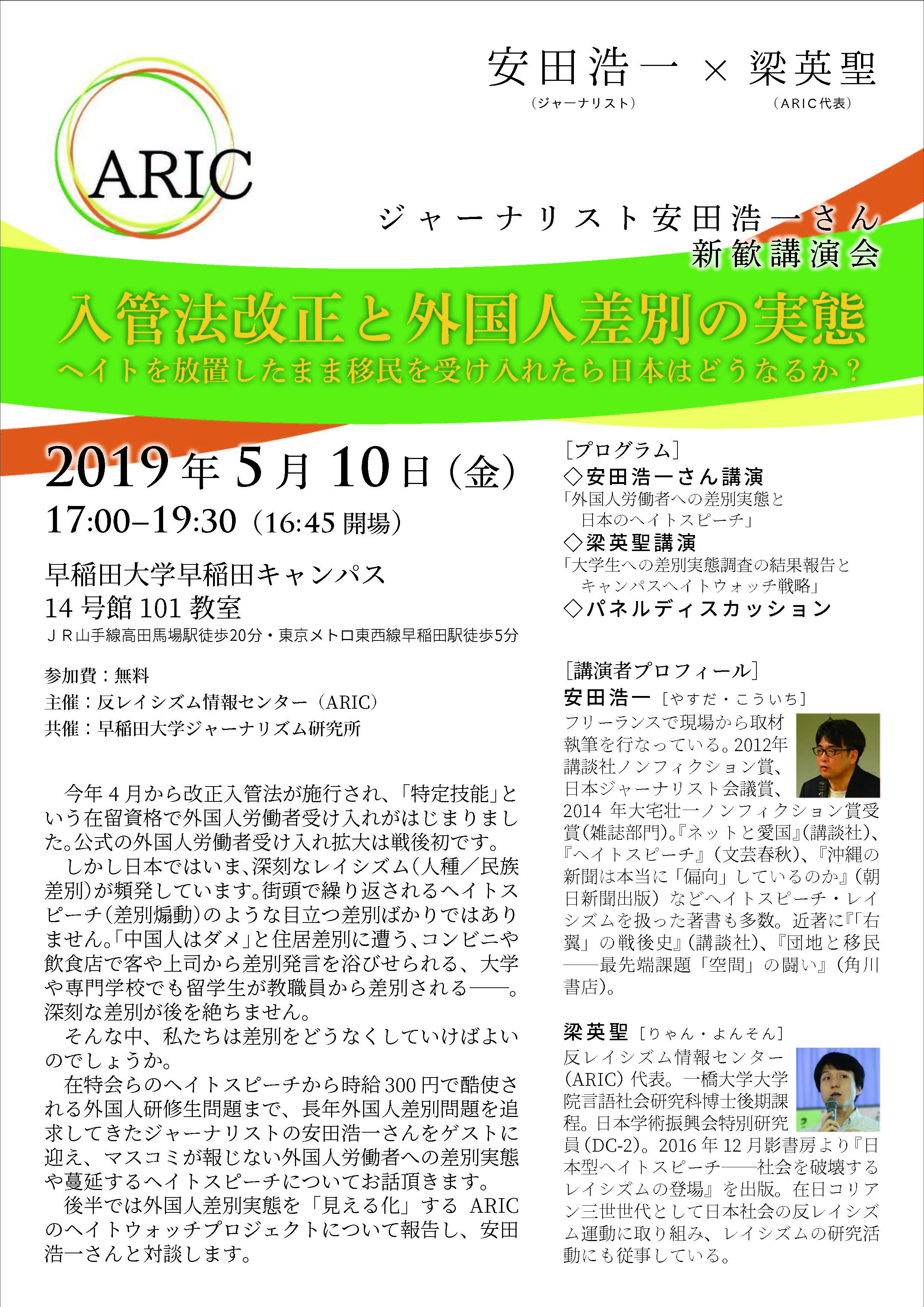 在特会らのヘイトスピーチから時給300円で酷使される外国人研修生問題まで、長年外国人差別問題を追求してきたジャーナリストの安田浩一さんをゲストに迎え、マスコミが報じない外国人労働者への差別実態や蔓延するヘイトスピーチについてお話頂きます。後半では、外国人差別実態を「見える化」するARICのヘイトウォッチプロジェクトについて報告し、安田浩一さんと対談します。