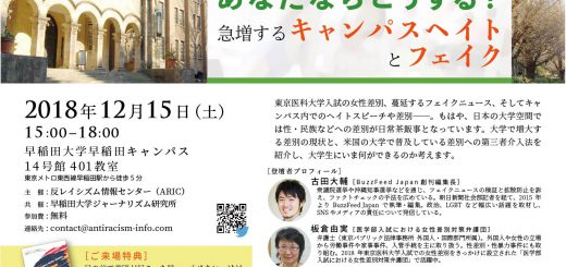 2018年5月13日、一橋大学にて、「ヘイトスピーチの最前線〜在日・沖縄・女性差別〜」というテーマで、ジャーナリストの安田浩一氏の講演会を反レイシズム情報センター(ARIC)主催で開催しました。
