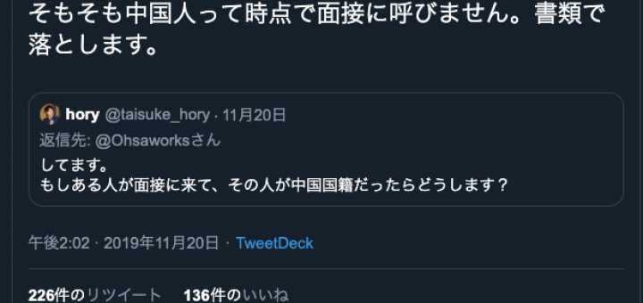 2019年11月29日 by antiracism-info · Published 2019年11月29日 · Last modified 2019年11月30日 2019年11月20日、大澤昇平 「そもそも中国人って時点で面接に呼びません。書類で落とします。