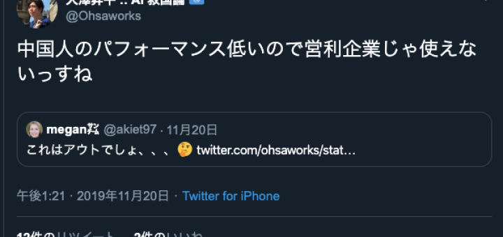 2019年11月29日 by antiracism-info · Published 2019年11月29日 · Last modified 2019年11月30日 2019年11月20日、大澤昇平 「中国人のパフォーマンス低いので営利企業じゃ使えないっすね