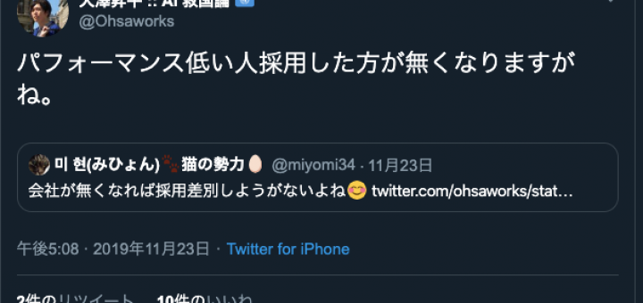 2019年11月29日 by antiracism-info · Published 2019年11月29日 · Last modified 2019年11月30日 2019年11月23日、大澤昇平 「パフォーマンス低い人採用した方が無くなりますがね。