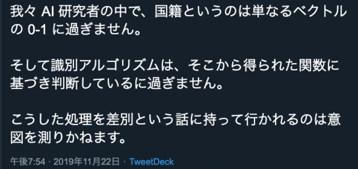 2019年11月29日 by antiracism-info · Published 2019年11月29日 · Last modified 2019年11月30日 2019年11月22日、大澤昇平 「我々 AI 研究者の中で、国籍というのは単なるベクトルの 0-1 に過ぎません。そして