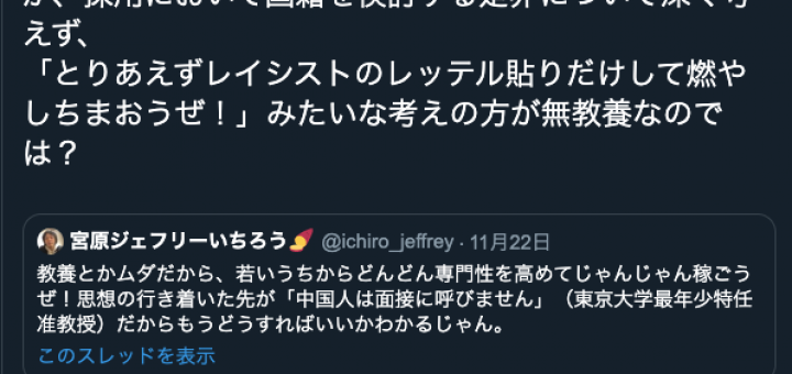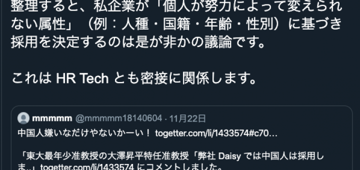 2019年11月29日 by antiracism-info · Published 2019年11月29日 · Last modified 2019年11月30日 2019年11月22日、大澤昇平 「まるで教養があれば面接に呼ぶかのような言い方ですが、採用において国籍を検討する